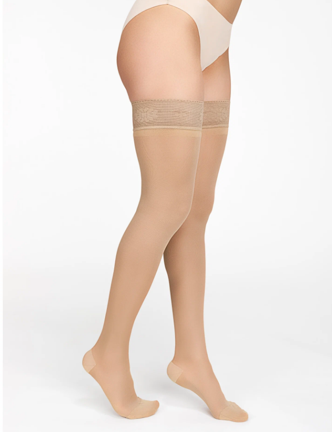Женские чулки с ажурным верхом 223 Orto 2 класс компрессии, полупрозрачные. Создают умеренную дозированную компрессию от лодыжки до верхней трети бедра. Имеют силиконовую ленту в верхней части для фиксации.